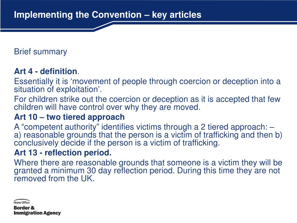 Implementing the Convention – key articles • Brief summary • Art 4 - definition. • Essentially it is ‘movement of people through coercion or deception into a situation of exploitation’. • For children strike out the coercion or deception as it is accepted that few children will have control over why they are moved. • Art 10 – two tiered approach • A “competent authority” identifies victims through a 2 tiered approach: – a) reasonable grounds that the person is a victim of trafficking and then b) conclusively decide if the person is a victim of trafficking. • Art 13 - reflection period. • Where there are reasonable grounds that someone is a victim they will be granted a minimum 30 day reflection period. During this time they are not removed from the UK.