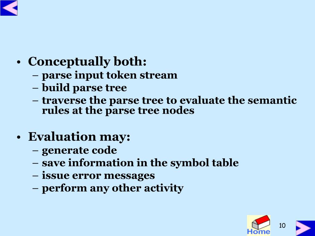 Conceptually both: • parse input token stream • build parse tree • traverse the parse tree to evaluate the semantic rules at the parse tree nodes • Evaluation may: • generate code • save information in the symbol table • issue error messages • perform any other activity