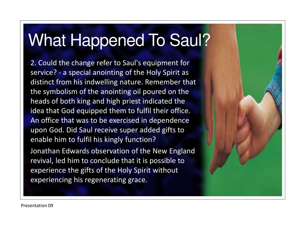 2. Could the change refer to Saul's equipment for service? - a special anointing of the Holy Spirit as distinct from his indwelling nature. Remember that the symbolism of the anointing oil poured on the heads of both king and high priest indicated the idea that God equipped them to fulfil their office. An office that was to be exercised in dependence upon God. Did Saul receive super added gifts to enable him to fulfil his kingly function? Jonathan Edwards observation of the New England revival, led him to conclude that it is possible to experience the gifts of the Holy Spirit without experiencing his regenerating grace. What Happened To Saul? Presentation 09