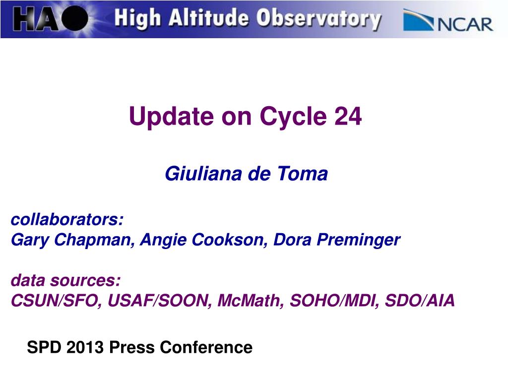 Update on Cycle 24 Giuliana de Toma collaborators: Gary Chapman, Angie Cookson, Dora Preminger data sources: CSUN/SFO, USAF/SOON, McMath, SOHO/MDI, SDO/AIA SPD 2013 Press Conference