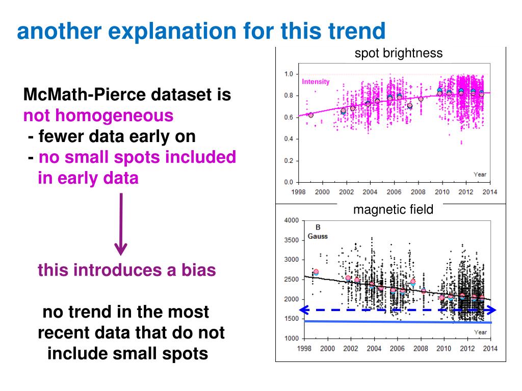 another explanation for this trend McMath-Pierce dataset is not homogeneous - fewer data early on - no small spots included in early data this introduces a bias no trend in the most recent data that do not include small spots magnetic field spot brightness