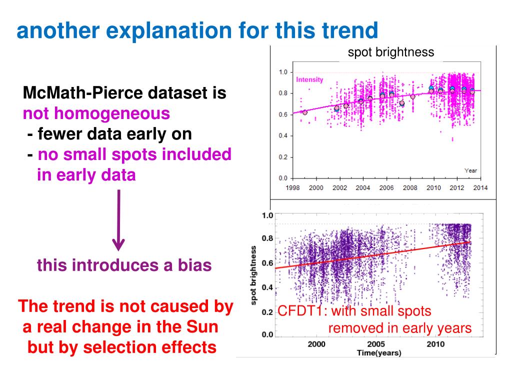 another explanation for this trend McMath-Pierce dataset is not homogeneous - fewer data early on - no small spots included in early data this introduces a bias The trend is not caused by a real change in the Sun but by selection effects CFDT1: with small spots removed in early years spot brightness