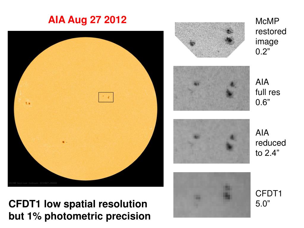 AIA Aug 27 2012 McMP restored image 0.2” AIA full res 0.6” AIA reduced to 2.4” CFDT1 5.0” CFDT1 low spatial resolution but 1% photometric precision