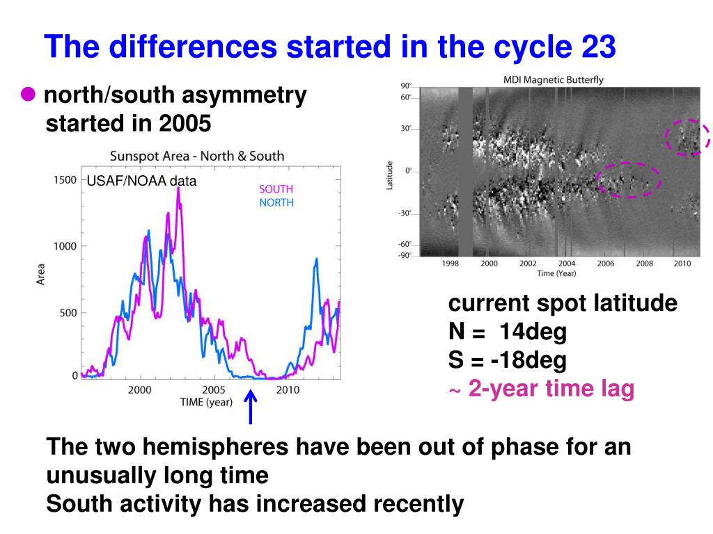 The differences started in the cycle 23 l north/south asymmetry started in 2005 USAF/NOAA data current spot latitude N = 14deg S = -18deg ~ 2-year time lag The two hemispheres have been out of phase for an unusually long time South activity has increased recently