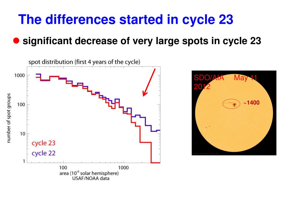 The differences started in cycle 23 lsignificant decrease of very large spots in cycle 23 SDO/AIA May 11 2012 ~1400