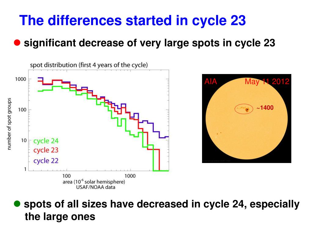 The differences started in cycle 23 lsignificant decrease of very large spots in cycle 23 AIA May 11 2012 ~1400 lspots of all sizes have decreased in cycle 24, especially the large ones