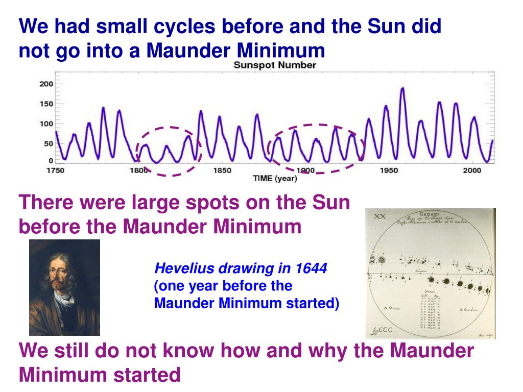We had small cycles before and the Sun did not go into a Maunder Minimum There were large spots on the Sun before the Maunder Minimum Heveliusdrawing in 1644 (one year before the Maunder Minimum started) We still do not know how and why the Maunder Minimum started