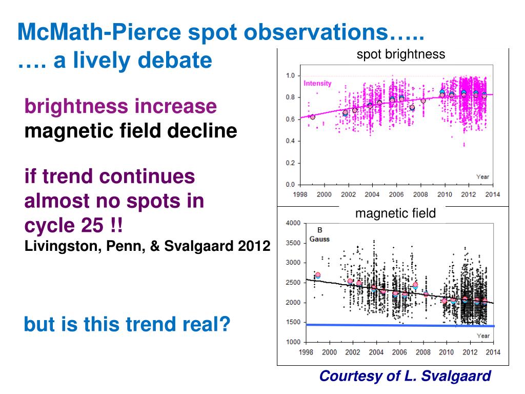 McMath-Pierce spot observations….. …. a lively debate brightness increase magnetic field decline if trend continues almost no spots in cycle 25 !! Livingston, Penn, & Svalgaard 2012 but is this trend real? spot brightness magnetic field Courtesy of L. Svalgaard