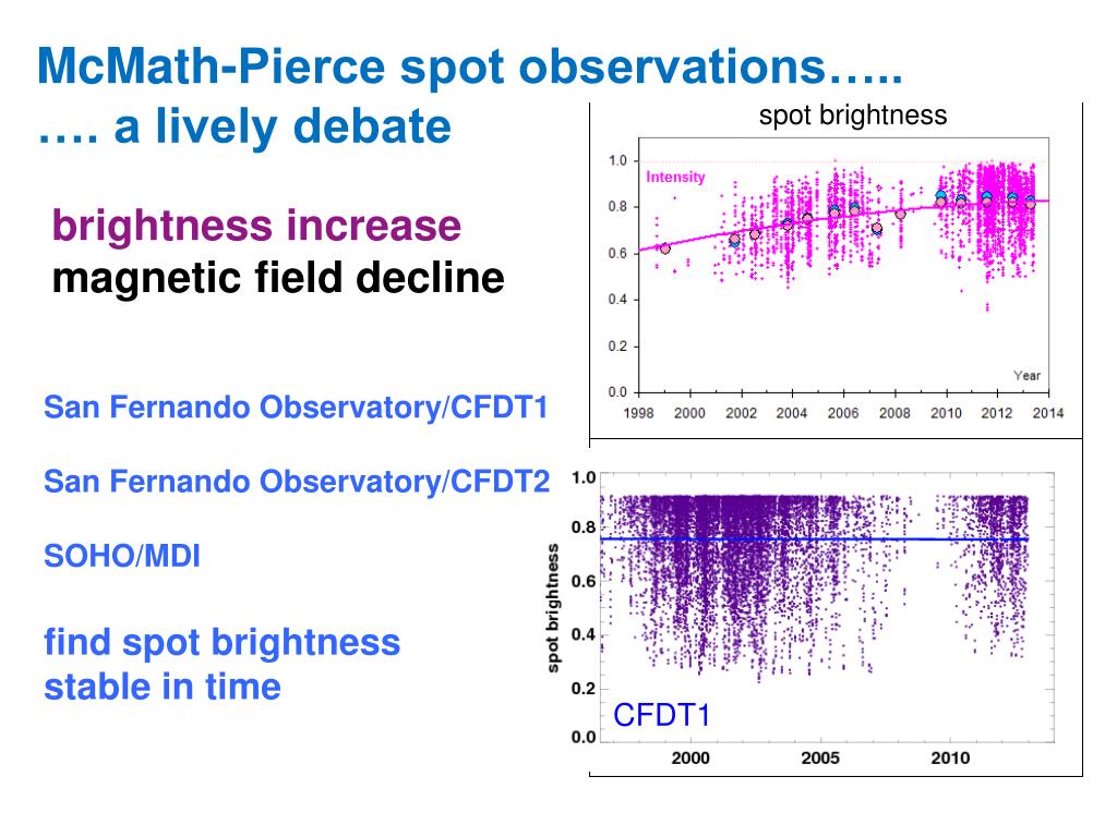 McMath-Pierce spot observations….. …. a lively debate brightness increase magnetic field decline San Fernando Observatory/CFDT1 San Fernando Observatory/CFDT2 SOHO/MDI find spot brightness stable in time CFDT1 spot brightness