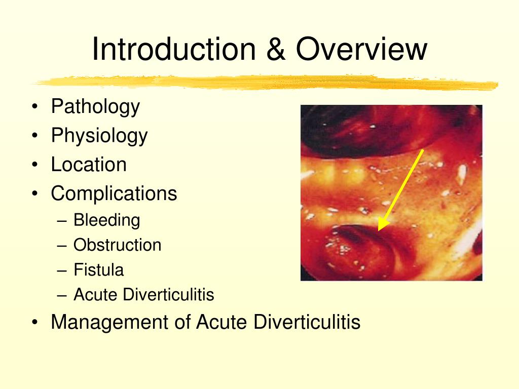Introduction & Overview • Pathology • Physiology • Location • Complications • Bleeding • Obstruction • Fistula • Acute Diverticulitis • Management of Acute Diverticulitis