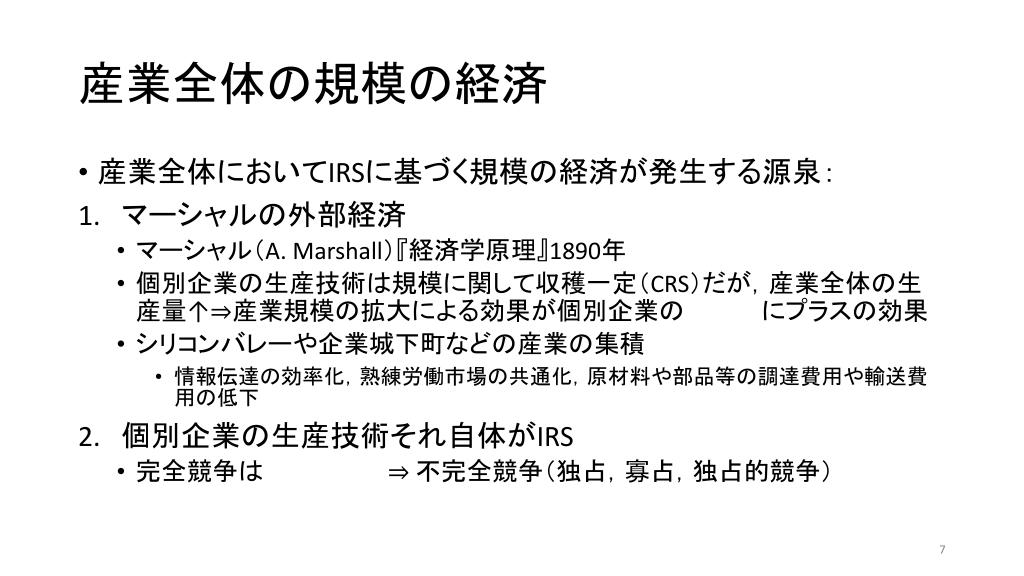 産業全体の規模の経済 • 産業全体においてIRSに基づく規模の経済が発生する源泉: • マーシャルの外部経済 • マーシャル(A. Marshall)『経済学原理』1890年 • 個別企業の生産技術は規模に関して収穫一定(CRS)だが,産業全体の生産量↑⇒産業規模の拡大による効果が個別企業の生産性にプラスの効果 • シリコンバレーや企業城下町などの産業の集積 • 情報伝達の効率化,熟練労働市場の共通化,原材料や部品等の調達費用や輸送費用の低下 • 個別企業の生産技術それ自体がIRS • 完全競争は成立しない ⇒ 不完全競争(独占,寡占,独占的競争)