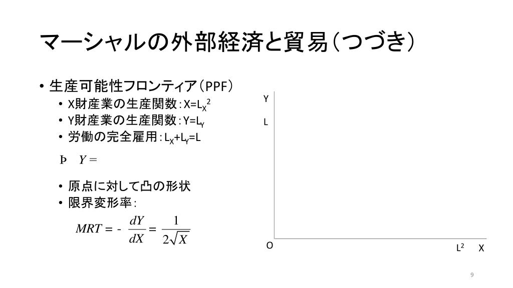 マーシャルの外部経済と貿易(つづき) • 生産可能性フロンティア(PPF) • X財産業の生産関数:X=LX2 • Y財産業の生産関数:Y=LY • 労働の完全雇用:LX+LY=L • 原点に対して凸の形状 • 限界変形率: Y L O L2 X