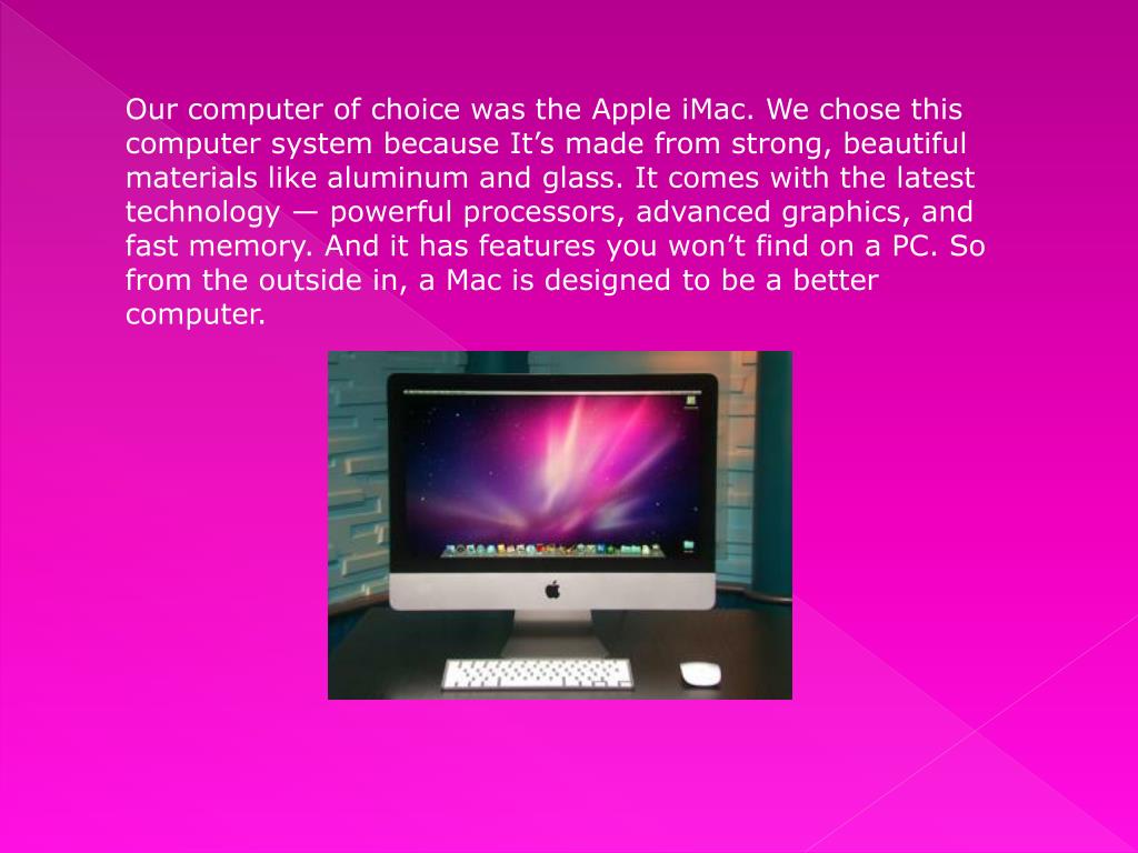 Our computer of choice was the Apple iMac. We chose this computer system because It’s made from strong, beautiful materials like aluminum and glass. It comes with the latest technology — powerful processors, advanced graphics, and fast memory. And it has features you won’t find on a PC. So from the outside in, a Mac is designed to be a better computer.