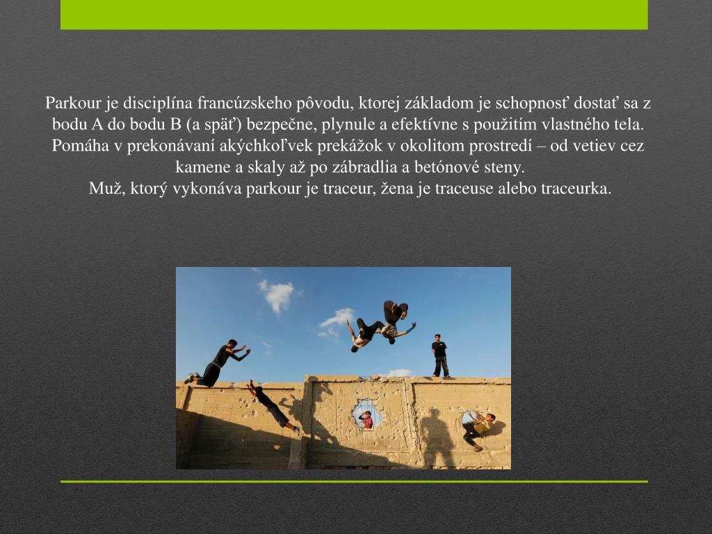Parkourje disciplína francúzskeho pôvodu, ktorej základom je schopnosť dostať sa z bodu A do bodu B (a späť) bezpečne, plynule a efektívne s použitím vlastného tela. Pomáha v prekonávaní akýchkoľvek prekážok v okolitom prostredí – od vetiev cez kamene a skaly až po zábradlia a betónové steny.Muž, ktorý vykonáva parkour je traceur, žena je traceuse alebo traceurka.