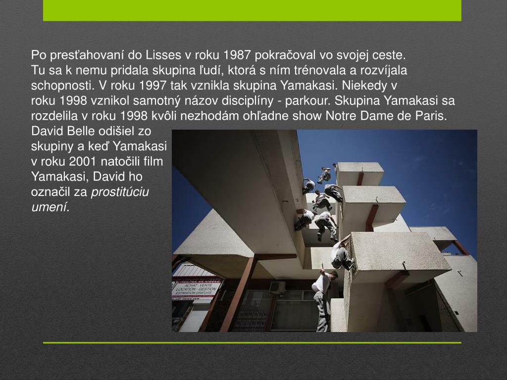 Po presťahovaní do Lisses v roku 1987pokračoval vo svojej ceste. Tu sa k nemu pridala skupina ľudí, ktorá s ním trénovala a rozvíjala schopnosti. V roku 1997 tak vznikla skupina Yamakasi. Niekedy v roku 1998 vznikol samotný názov disciplíny - parkour. Skupina Yamakasi sa rozdelila v roku 1998 kvôli nezhodám ohľadne show NotreDamedeParis. DavidBelleodišiel zo skupiny a keď Yamakasi v roku 2001 natočili film Yamakasi, David ho označil za prostitúciu umení.