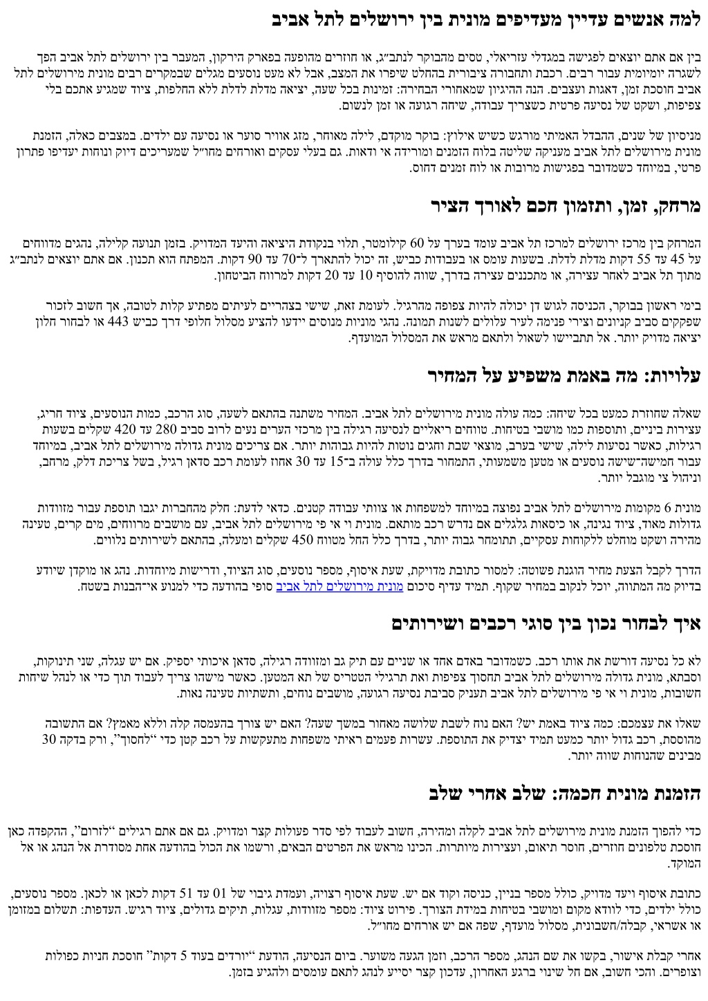 .םייניב תדוקנ וז םא הווקת חתפל השיגב וא אצומ דיל ימואתפ קקפב שונא יסחי לע הלימ חמשנ“ :םיאלפ השוע העיסנה תליחתב ןטק ןמיס .חחושל ץפחש ימ שיו ,טקש ףידעמש ימ שי .1 שיבכ לע אוהשכ םג רדחה תא אורקל עדוי בוט גהנ םישנא ורחבתש לככ .השוחת םג איה ,B־ל A קר אל איה הבוט העיסנ .”ךרדב בוט הפקל תוצלמהל חמשנ“ וא ,”םוז תוחיש ונל שי ,טקשל .רתוי הלקו הרצק שיגרת םירעה יתש ןיב ךרדה ךכ ,םכלש תוחונהו ןמזה תא םידבכמש םיתורישו סרפסקא אמלא לארשי ,םילשורי :תבותכ 050-912-2133:ןופלט almaxpress.com:רתא ביבא לת · ג״בתנ · שמש תיב · םילשורי :תוריש ירוזא תועיסנ · הפועתה הדשל תורבעה · VIP תועסה · ביבא לת תוינומ · שמש תיב תוינומ · םילשורי תוינומ · ג״בתנל תינומ :תוריש תוירוגטק םיעוריאל תועסה · תונולמל תועסה · תוינוריע-ןיב ירבוד םייעוצקמ םיגהנ ,24/7 תונימז .ביבא לתו ג״בתנ ,שמש תיב ,םילשוריב VIP תועסהו תוינומ יתוריש – סרפסקא אמלא :(Blurb) רואית תונולמל תועסה ,תוינוריע-ןיב תועיסנ ,ונממו ג״בתנל תורבעהב תוחמתה .םיקסע ישנאו םיריית ,תוחפשמל םיחוורמו םישידח םיבכרו ,תילגנא .ןמזב קיודמו חוטב ,ןימא תוריש החיטבמ שארמ הנמזה .ץראה לכב םייטרפ םירויסו ,םיעוריאלו Almaxpress Address: Jerusalem, Israel Phone:+972 50-912-2133 Website:almaxpress.com Service Areas: Jerusalem · Beit Shemesh · Ben Gurion Airport · Tel Aviv Service Categories: Taxi to Ben Gurion Airport · Jerusalem Taxi · Beit Shemesh Taxi · Tel Aviv Taxi · VIP Transfers · Airport Transfers · Intercity Rides · Hotel Transfers · Event Transfers Blurb: ALMA Express provides premium taxi and VIP transfer services in Jerusalem, Beit Shemesh, Ben Gurion Airport, and Tel Aviv. Available 24/7 with professional English-speaking drivers and modern, spacious vehicles for families, tourists, and business travelers. We specialize in airport transfers, intercity rides, hotel and event transport, and private tours across Israel. Book in advance for reliable, safe, on-time service.