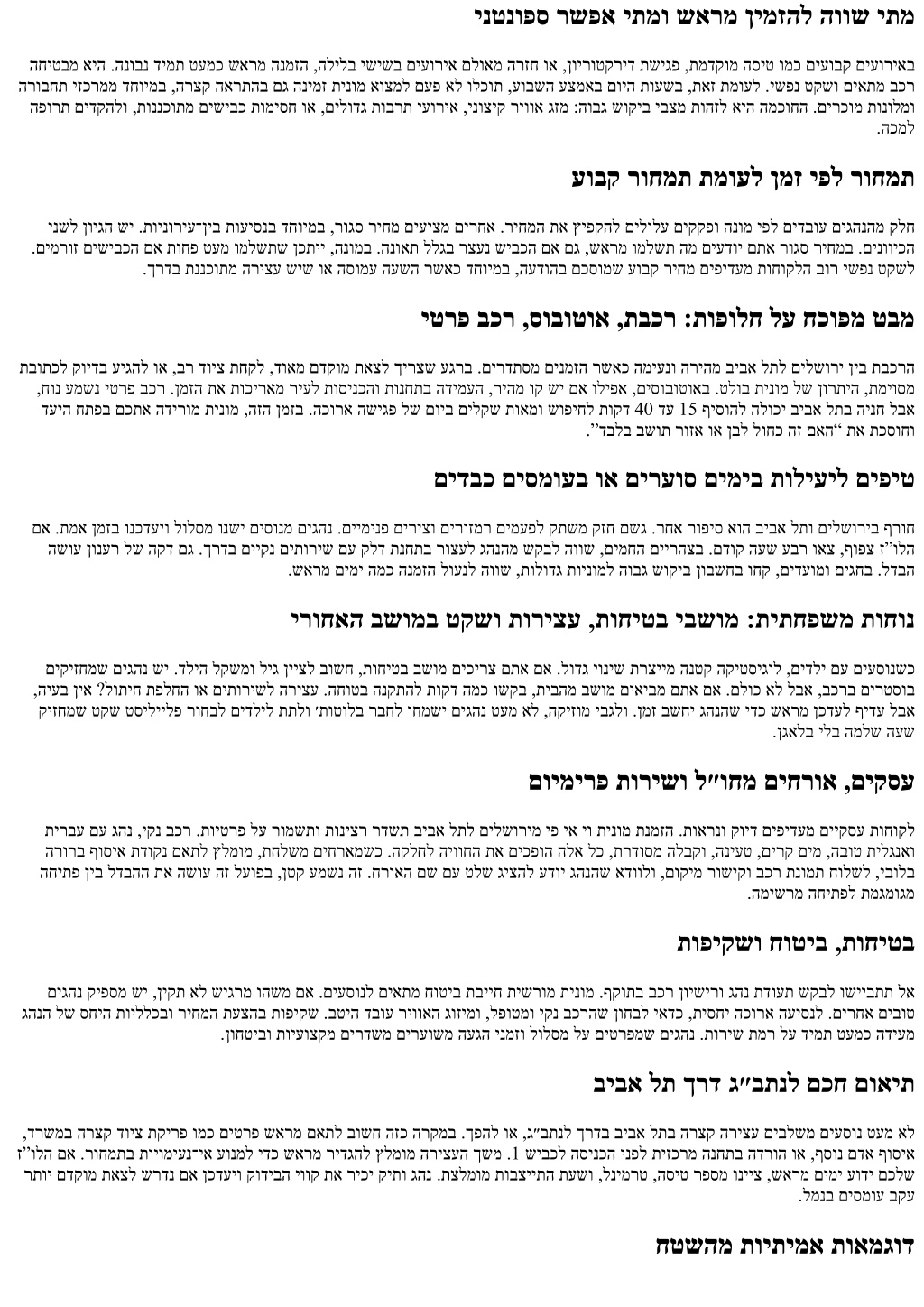 ינטנופס רשפא יתמו שארמ ןימזהל הווש יתמ החיטבמ איה .הנובנ דימת טעמכ שארמ הנמזה ,הלילב ישישב םיעוריא םלואמ הרזח וא ,ןוירוטקריד תשיגפ ,תמדקומ הסיט ומכ םיעובק םיעוריאב הרובחת יזכרממ דחוימב ,הרצק הארתהב םג הנימז תינומ אוצמל םעפ אל ולכות ,עובשה עצמאב םויה תועשב ,תאז תמועל .ישפנ טקשו םיאתמ בכר הפורת םידקהלו ,תוננכותמ םישיבכ תומיסח וא ,םילודג תוברת יעוריא ,ינוציק ריווא גזמ :הובג שוקיב יבצמ תוהזל איה המכוחה .םירכומ תונולמו .הכמל עובק רוחמת תמועל ןמז יפל רוחמת ינשל ןויגה שי .תוינוריע־ןיב תועיסנב דחוימב ,רוגס ריחמ םיעיצמ םירחא .ריחמה תא ץיפקהל םילולע םיקקפו הנומ יפל םידבוע םיגהנהמ קלח .םימרוז םישיבכה םא תוחפ טעמ ומלשתש ןכתיי ,הנומב .הנואת ללגב רצענ שיבכה םא םג ,שארמ ומלשת המ םיעדוי םתא רוגס ריחמב .םינוויכה .ךרדב תננכותמ הריצע שיש וא הסומע העשה רשאכ דחוימב ,העדוהב םכסומש עובק ריחמ םיפידעמ תוחוקלה בור ישפנ טקשל יטרפ בכר ,סובוטוא ,תבכר :תופולח לע חכופמ טבמ תבותכל קוידב עיגהל וא ,בר דויצ תחקל ,דואמ םדקומ תאצל ךירצש עגרב .םירדתסמ םינמזה רשאכ המיענו הריהמ ביבא לתל םילשורי ןיב תבכרה ,חונ עמשנ יטרפ בכר .ןמזה תא תוכיראמ ריעל תוסינכהו תונחתב הדימעה ,ריהמ וק שי םא וליפא ,םיסובוטואב .טלוב תינומ לש ןורתיה ,תמיוסמ דעיה חתפב םכתא הדירומ תינומ ,הזה ןמזב .הכורא השיגפ לש םויב םילקש תואמו שופיחל תוקד 40 דע 15 ףיסוהל הלוכי ביבא לתב הינח לבא .”דבלב בשות רוזא וא ןבל לוחכ הז םאה“ תא תכסוחו םידבכ םיסמועב וא םירעוס םימיב תוליעיל םיפיט םא .תמא ןמזב ונכדעיו לולסמ ונשי םיסונמ םיגהנ .םיימינפ םיריצו םירוזמר םימעפל קתשמ קזח םשג .רחא רופיס אוה ביבא לתו םילשוריב ףרוח השוע ןונער לש הקד םג .ךרדב םייקנ םיתוריש םע קלד תנחתב רוצעל גהנהמ שקבל הווש ,םימחה םיירהצב .םדוק העש עבר ואצ ,ףופצ ז”ולה .שארמ םימי המכ הנמזה לוענל הווש ,תולודג תוינומל הובג שוקיב ןובשחב וחק ,םידעומו םיגחב .לדבה ירוחאה בשומב טקשו תוריצע ,תוחיטב יבשומ :תיתחפשמ תוחונ םיקיזחמש םיגהנ שי .דליה לקשמו ליג ןייצל בושח ,תוחיטב בשומ םיכירצ םתא םא .לודג יוניש תרציימ הנטק הקיטסיגול ,םידלי םע םיעסונשכ ,היעב ןיא ?לותיח תפלחה וא םיתורישל הריצע .החוטב הנקתהל תוקד המכ ושקב ,תיבהמ בשומ םיאיבמ םתא םא .םלוכ אל לבא ,בכרב םירטסוב קיזחמש טקש טסיליילפ רוחבל םידליל תתלו ׳תוטולב רבחל וחמשי םיגהנ טעמ אל ,הקיזומ יבגלו .ןמז בשחי גהנהש ידכ שארמ ןכדעל ףידע לבא .ןגאלב ילב המלש העש םוימירפ תורישו ל״וחמ םיחרוא ,םיקסע תירבע םע גהנ ,יקנ בכר .תויטרפ לע רומשתו תוניצר רדשת ביבא לתל םילשורימ יפ יא יו תינומ תנמזה .תוארנו קויד םיפידעמ םייקסע תוחוקל הרורב ףוסיא תדוקנ םאתל ץלמומ ,תחלשמ םיחראמשכ .הקלחל היווחה תא םיכפוה הלא לכ ,תרדוסמ הלבקו ,הניעט ,םירק םימ ,הבוט תילגנאו החיתפ ןיב לדבהה תא השוע הז לעופב ,ןטק עמשנ הז .חרואה םש םע טלש גיצהל עדוי גהנהש אדוולו ,םוקימ רושיקו בכר תנומת חולשל ,יבולב .המישרמ החיתפל תמגמוגמ תופיקשו חוטיב ,תוחיטב םיגהנ קיפסמ שי ,ןיקת אל שיגרמ והשמ םא .םיעסונל םיאתמ חוטיב תבייח תישרומ תינומ .ףקותב בכר ןוישירו גהנ תדועת שקבל ושייבתת לא גהנה לש סחיה תויללכבו ריחמה תעצהב תופיקש .בטיה דבוע ריוואה גוזימו ,לפוטמו יקנ בכרהש ןוחבל יאדכ ,תיסחי הכורא העיסנל .םירחא םיבוט .ןוחטיבו תויעוצקמ םירדשמ םירעושמ העגה ינמזו לולסמ לע םיטרפמש םיגהנ .תוריש תמר לע דימת טעמכ הדיעמ ביבא לת ךרד ג״בתנל םכח םואית ,דרשמב הרצק דויצ תקירפ ומכ םיטרפ שארמ םאתל בושח הזכ הרקמב .ךפהל וא ,ג״בתנל ךרדב ביבא לתב הרצק הריצע םיבלשמ םיעסונ טעמ אל ז”ולה םא .רוחמתב תויומיענ־יא עונמל ידכ שארמ רידגהל ץלמומ הריצעה ךשמ .1 שיבכל הסינכה ינפל תיזכרמ הנחתב הדרוה וא ,ףסונ םדא ףוסיא רתוי םדקומ תאצל שרדנ םא ןכדעיו קודיבה יווק תא ריכי קיתו גהנ .תצלמומ תובצייתה תעשו ,לנימרט ,הסיט רפסמ ונייצ ,שארמ םימי עודי םכלש .למנב םיסמוע בקע חטשהמ תויתימא תו