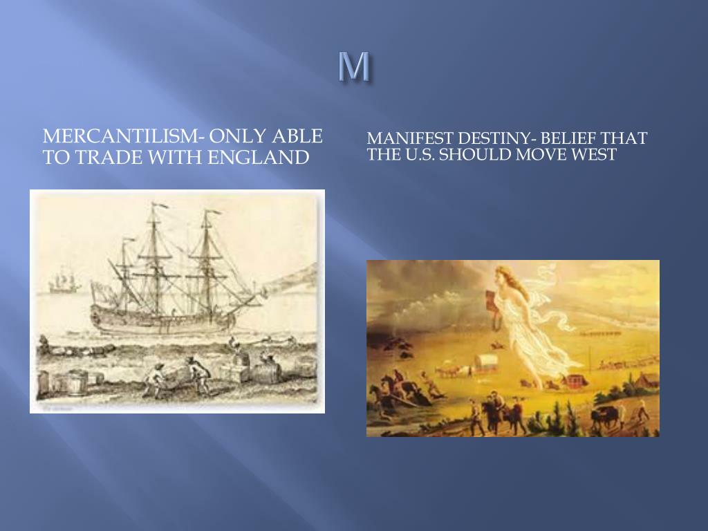 M Mercantilism- only able to trade with England Manifest destiny- belief that the u.s. should move west