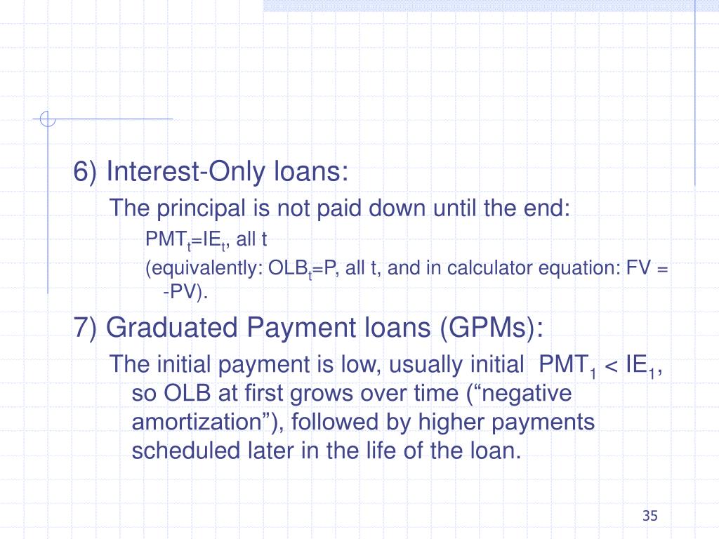 6) Interest-Only loans: The principal is not paid down until the end: PMTt=IEt, all t (equivalently: OLBt=P, all t, and in calculator equation: FV = -PV). 7) Graduated Payment loans (GPMs): The initial payment is low, usually initial PMT1 < IE1, so OLB at first grows over time (“negative amortization”), followed by higher payments scheduled later in the life of the loan.