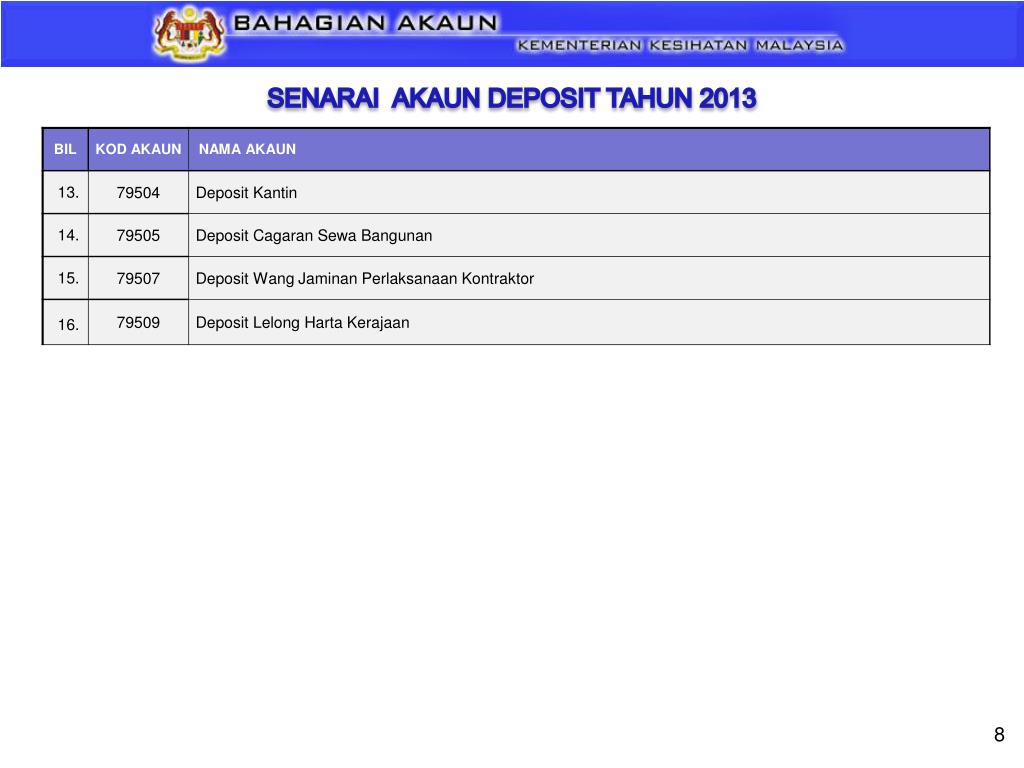 PENGURUSAN AKAUN DEPOSIT • 16 Kod Akaun Deposit • Surat Edaran Bahagian Akaun Bil. 1 Tahun 2012 – Kaedah Penghantaran Sijil/Penyata/Senarai Baki Berkaitan Dengan Akaun Vot, Hasil, Amanah, Deposit, Panjar Wang Runcit dan Panjar Khas • Senarai Baki Deposit Perseorangan (SBP) Seperti Pada 31 Disember – Lampiran B • Pelarasan Jurnal dari Akaun Deposit Bayaran Cagaran Hospital (Kod 76302, 76303, 76307 & 76308) ke kod hasil