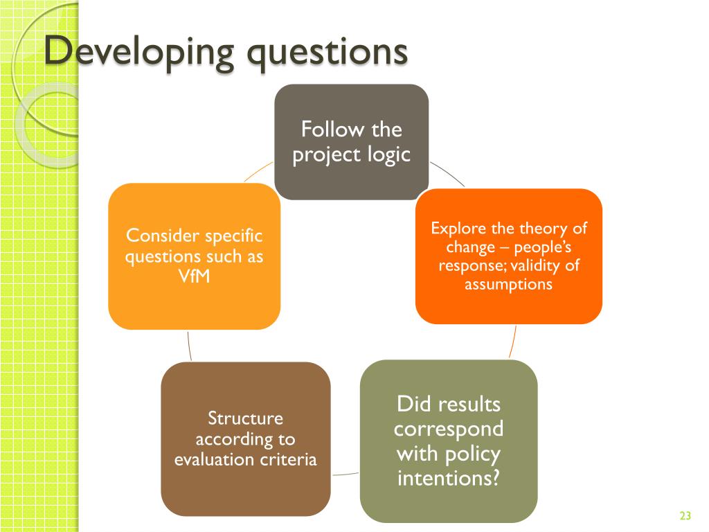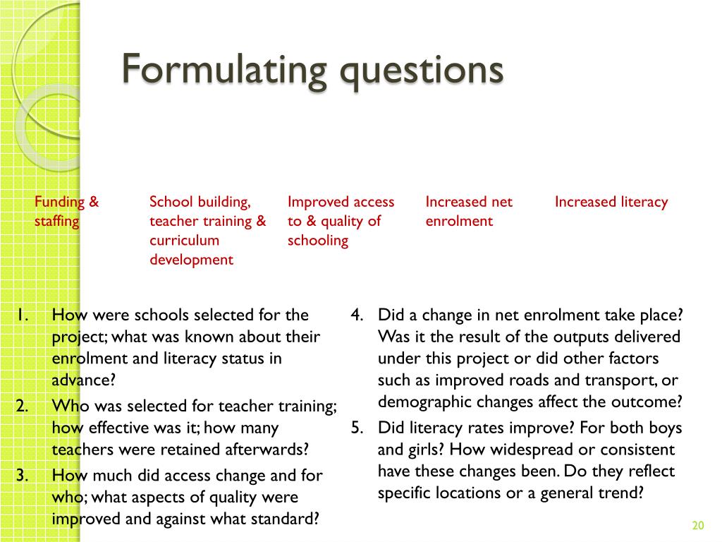 Formulating questions 1 2 3 4 5 • How were schools selected for the project; what was known about their enrolment and literacy status in advance? • Who was selected for teacher training; how effective was it; how many teachers were retained afterwards? • How much did access change and for who; what aspects of quality were improved and against what standard? • Did a change in net enrolment take place? Was it the result of the outputs delivered under this project or did other factors such as improved roads and transport, or demographic changes affect the outcome? • Did literacy rates improve? For both boys and girls? How widespread or consistent have these changes been. Do they reflect specific locations or a general trend? Funding & staffing School building, teacher training & curriculum development Improved access to & quality of schooling Increased net enrolment Increased literacy