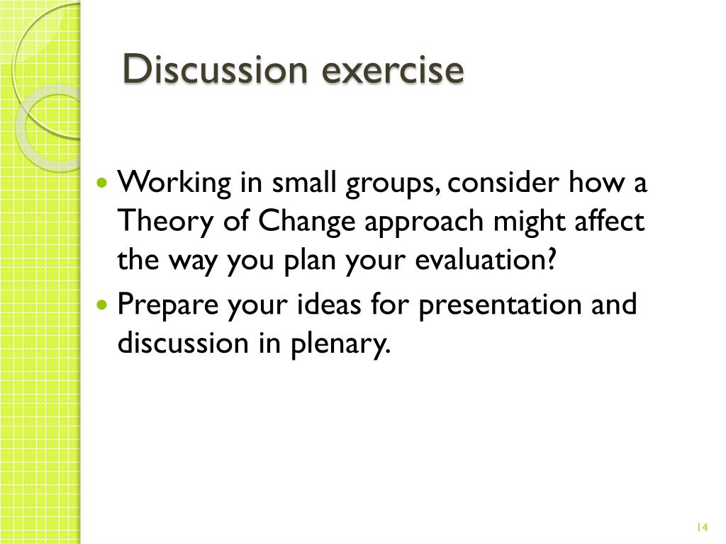 Discussion exercise • Working in small groups, consider how a Theory of Change approach might affect the way you plan your evaluation? • Prepare your ideas for presentation and discussion in plenary.