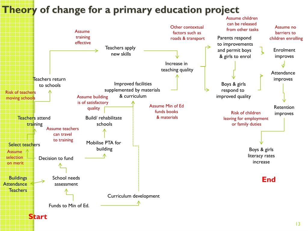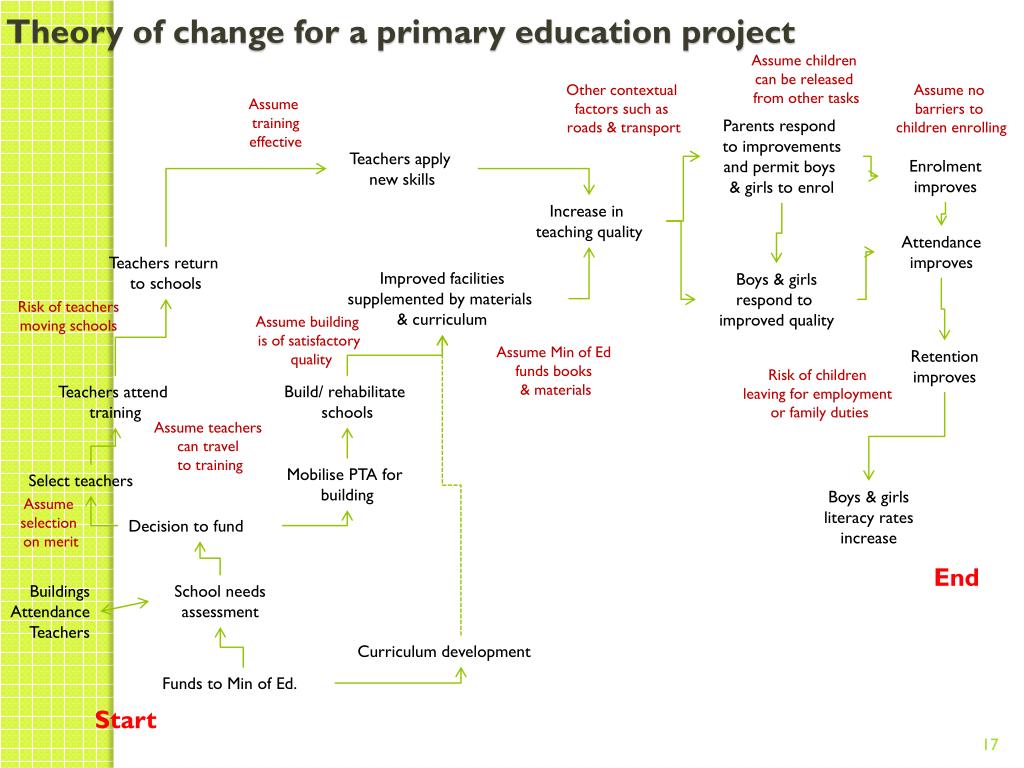 Theory of change for a primary education project Assume children can be released from other tasks Other contextual factors such as roads & transport Assume no barriers to children enrolling Assume training effective Parents respond to improvements and permit boys & girls to enrol Teachers apply new skills Enrolment improves Increase in teaching quality Attendance improves Teachers return to schools Improved facilities supplemented by materials & curriculum Boys & girls respond to improved quality Risk of teachers moving schools Assume building is of satisfactory quality Assume Min of Ed funds books & materials Retention improves Risk of children leaving for employment or family duties Build/ rehabilitate schools Teachers attend training Assume teachers can travel to training Mobilise PTA for building Select teachers Boys & girls literacy rates increase Assume selection on merit Decision to fund End School needs assessment Buildings Attendance Teachers Curriculum development Funds to Min of Ed. Start