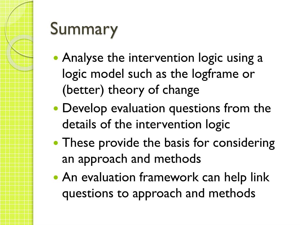Summary • Analyse the intervention logic using a logic model such as the logframe or (better) theory of change • Develop evaluation questions from the details of the intervention logic • These provide the basis for considering an approach and methods • An evaluation framework can help link questions to approach and methods