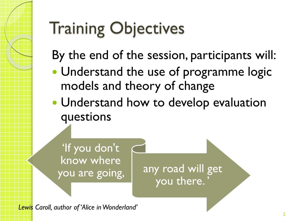 Training Objectives By the end of the session, participants will: • Understand the use of programme logic models and theory of change • Understand how to develop evaluation questions Lewis Caroll, author of ‘Alice in Wonderland’