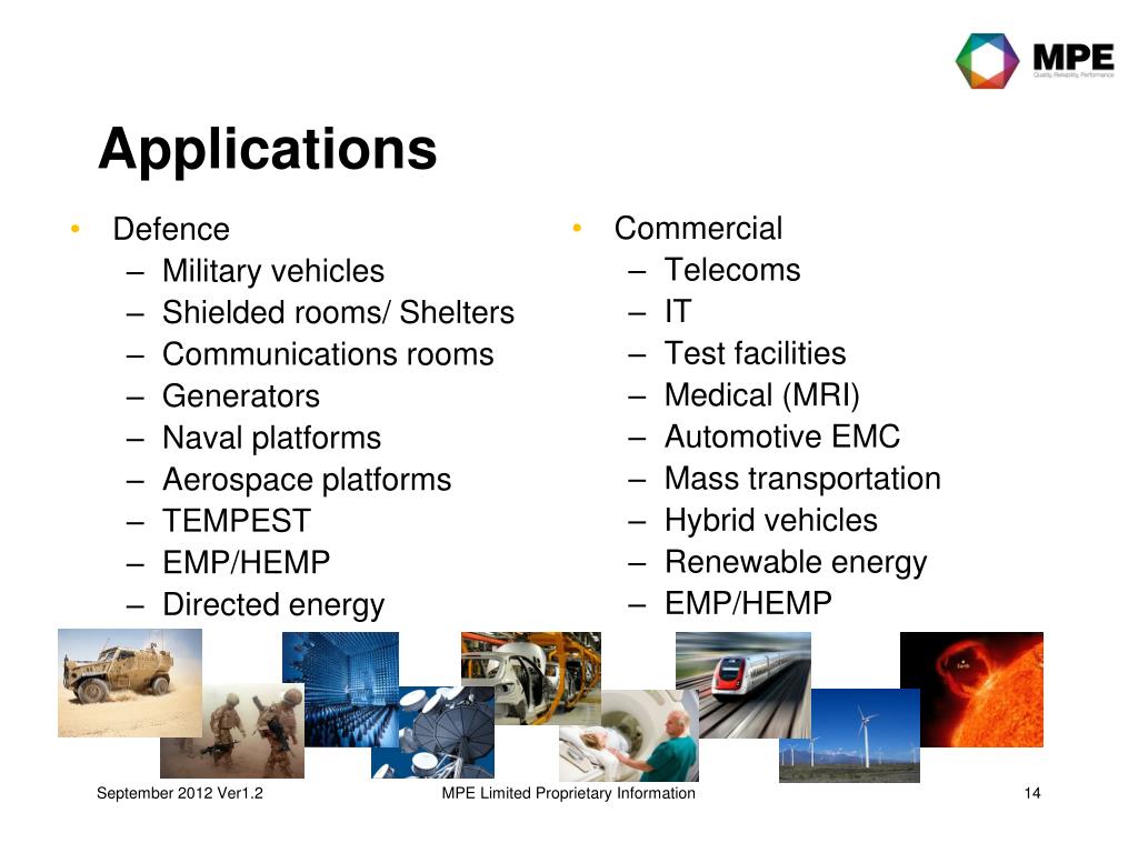 Defence Military vehicles Shielded rooms/ Shelters Communications rooms Generators Naval platforms Aerospace platforms TEMPEST EMP/HEMP Directed energy Commercial Telecoms IT Test facilities Medical (MRI) Automotive EMC Mass transportation Hybrid vehicles Renewable energy EMP/HEMP Applications MPE Limited Proprietary Information