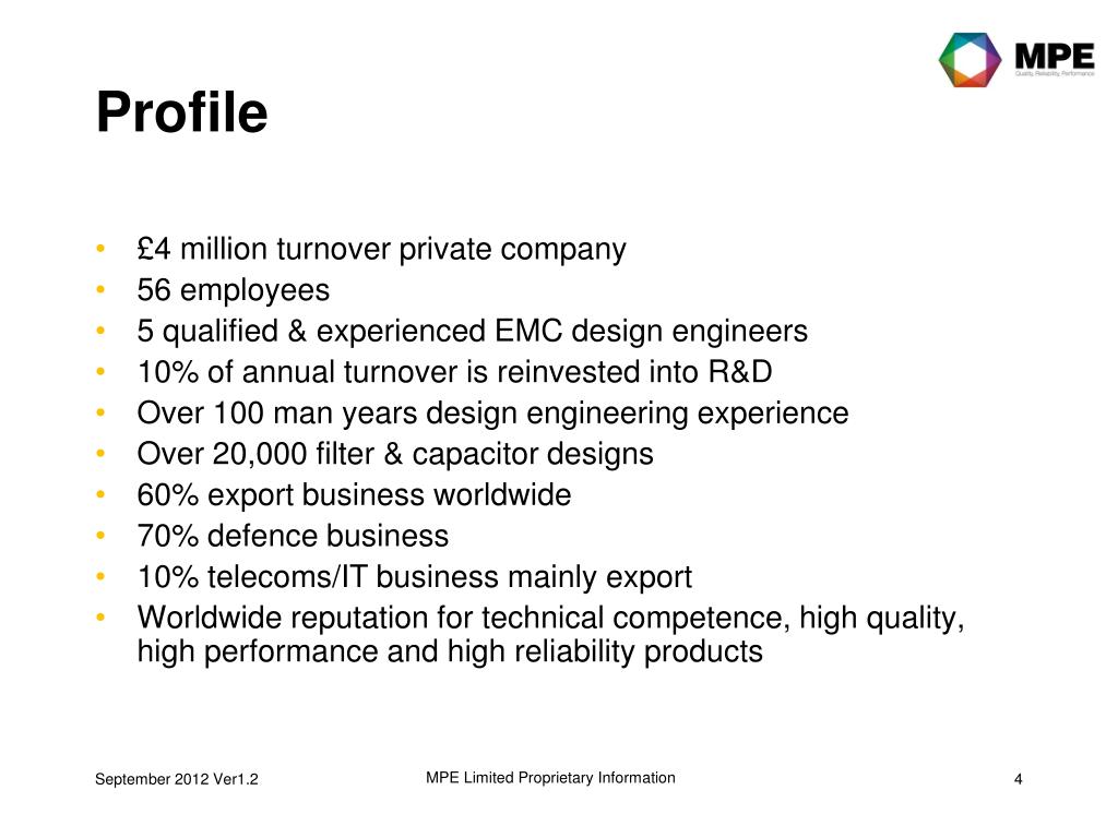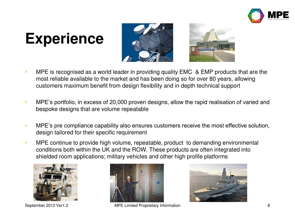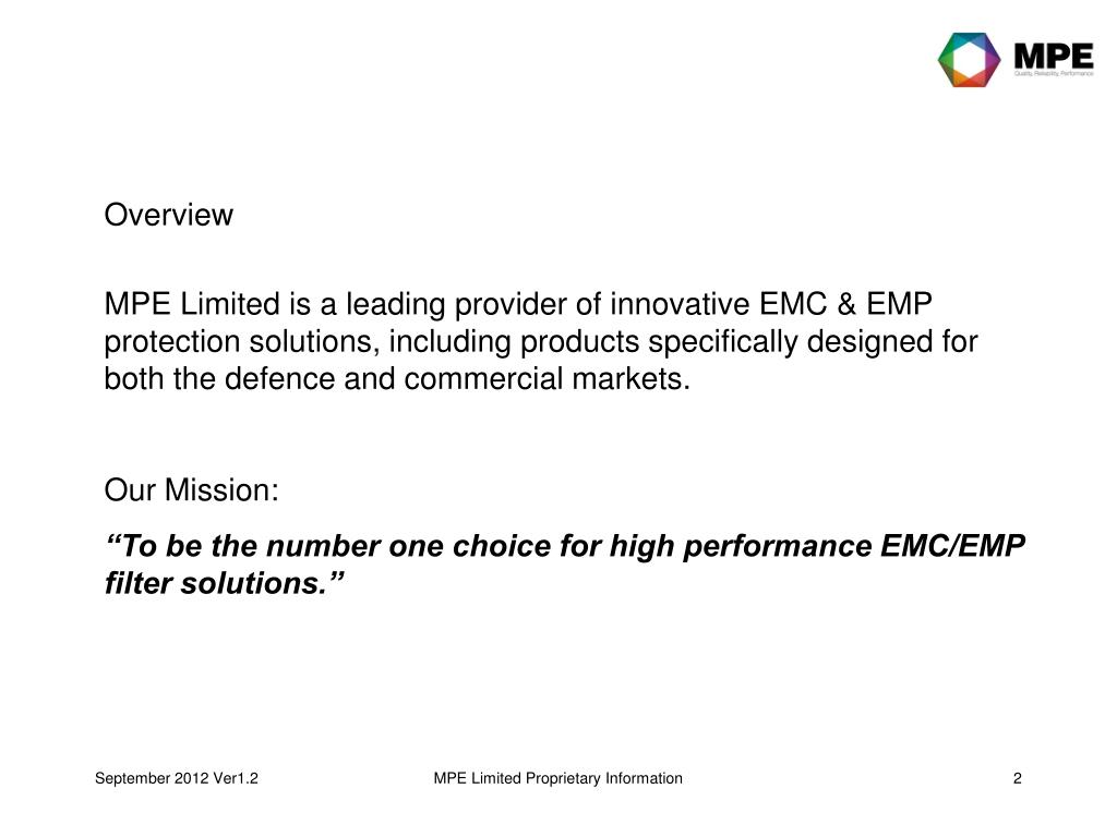 Overview MPE Limited is a leading provider of innovative EMC & EMP protection solutions, including products specifically designed for both the defence and commercial markets. Our Mission: “To be the number one choice for high performance EMC/EMP filter solutions.” MPE Limited Proprietary Information