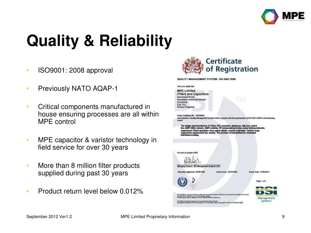 Quality & Reliability • ISO9001: 2008 approval • Previously NATO AQAP-1 • Critical components manufactured in house ensuring processes are all within MPE control • MPE capacitor & varistor technology in field service for over 30 years • More than 8 million filter products supplied during past 30 years • Product return level below 0.012% MPE Limited Proprietary Information