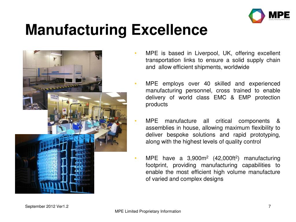 Manufacturing Excellence • MPE is based in Liverpool, UK, offering excellent transportation links to ensure a solid supply chain and allow efficient shipments, worldwide • MPE employs over 40 skilled and experienced manufacturing personnel, cross trained to enable delivery of world class EMC & EMP protection products • MPE manufacture all critical components & assemblies in house, allowing maximum flexibility to deliver bespoke solutions and rapid prototyping, along with the highest levels of quality control • MPE have a 3,900m2 (42,000ft2) manufacturing footprint, providing manufacturing capabilities to enable the most efficient high volume manufacture of varied and complex designs MPE Limited Proprietary Information