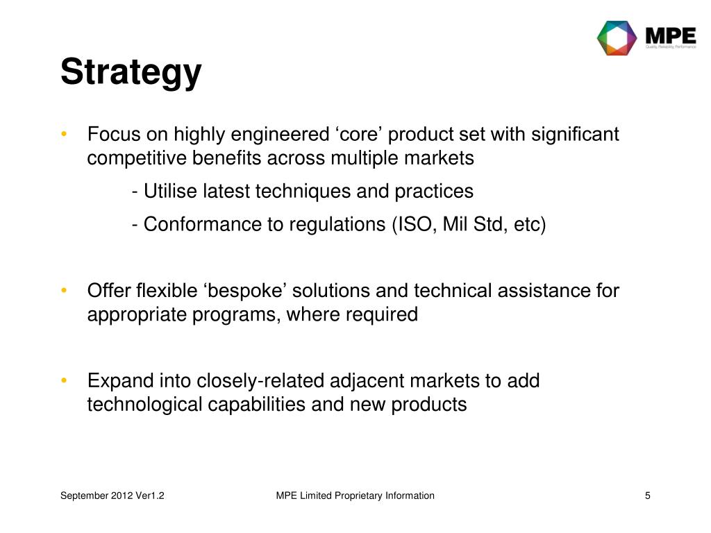 Strategy • Focus on highly engineered ‘core’ product set with significant competitive benefits across multiple markets - Utilise latest techniques and practices - Conformance to regulations (ISO, Mil Std, etc) • Offer flexible ‘bespoke’ solutions and technical assistance for appropriate programs, where required • Expand into closely-related adjacent markets to add technological capabilities and new products MPE Limited Proprietary Information