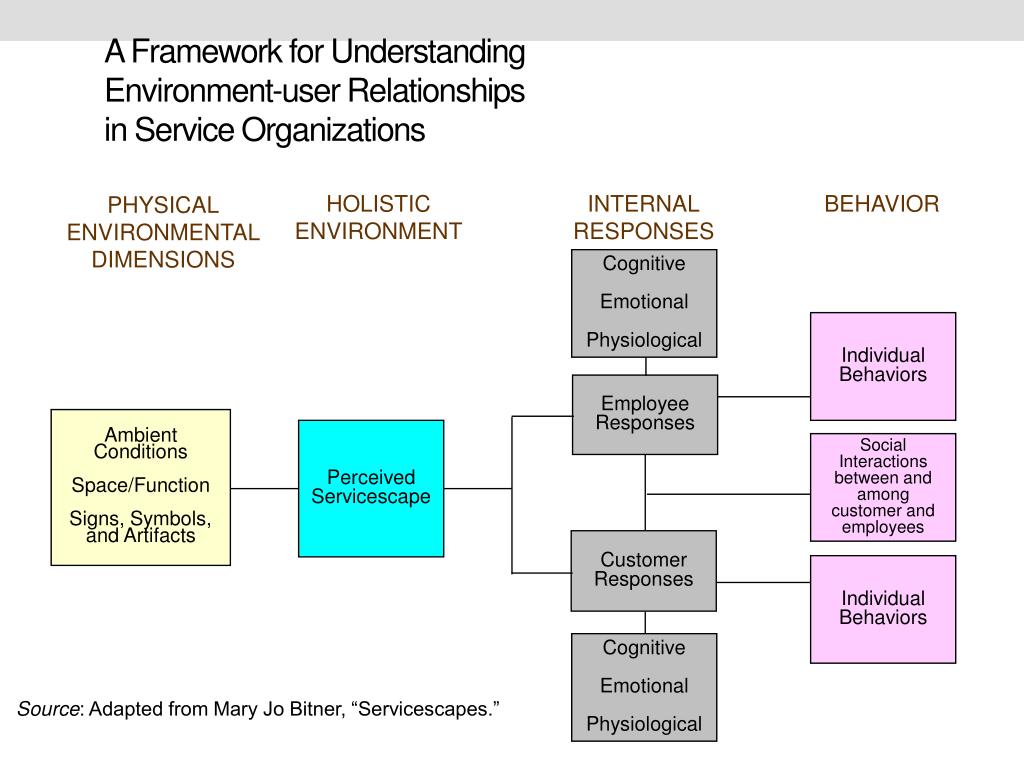 A Framework for UnderstandingEnvironment-user Relationships in Service Organizations HOLISTIC ENVIRONMENT INTERNAL RESPONSES BEHAVIOR PHYSICAL ENVIRONMENTAL DIMENSIONS Cognitive Emotional Physiological Individual Behaviors Employee Responses Ambient Conditions Space/Function Signs, Symbols, and Artifacts Perceived Servicescape Social Interactions between and among customer and employees Customer Responses Individual Behaviors Cognitive Emotional Physiological Source: Adapted from Mary Jo Bitner, “Servicescapes.”