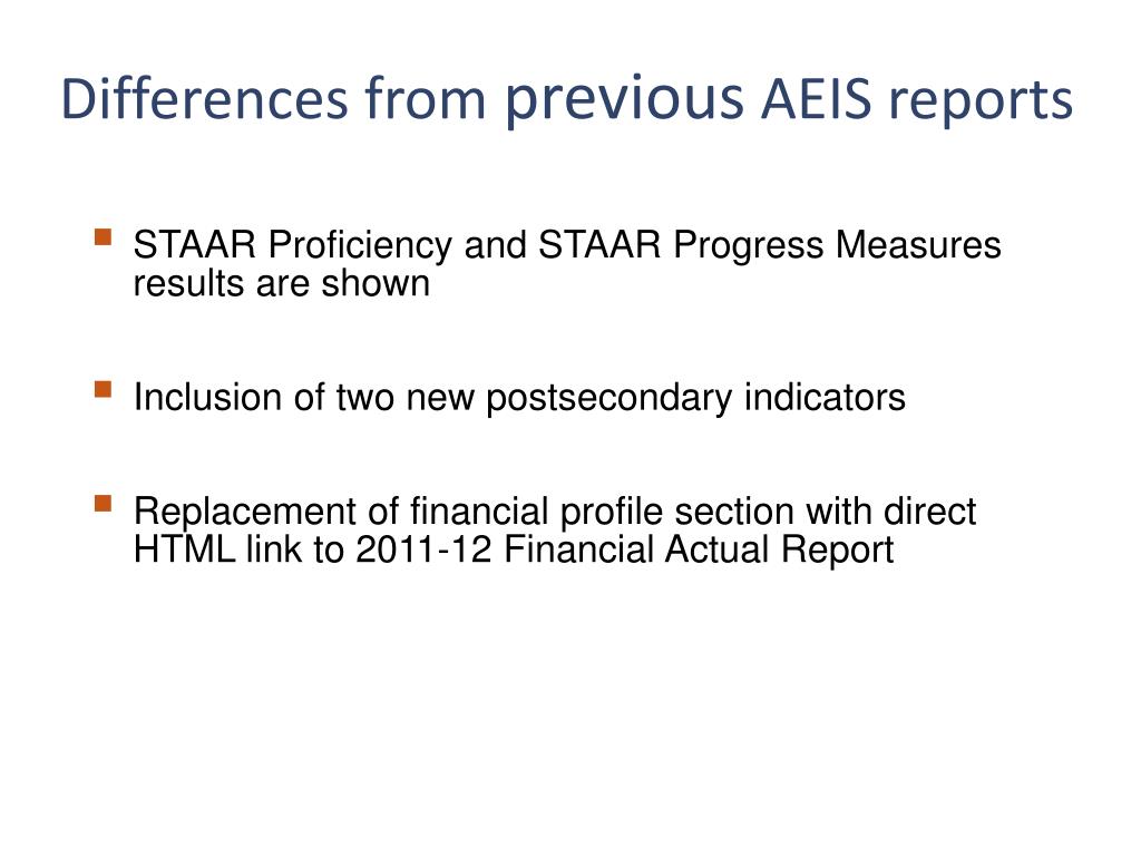 Differences from previous AEIS reports • STAAR Proficiency and STAAR Progress Measures results are shown • Inclusion of two new postsecondary indicators • Replacement of financial profile section with direct HTML link to 2011-12 Financial Actual Report