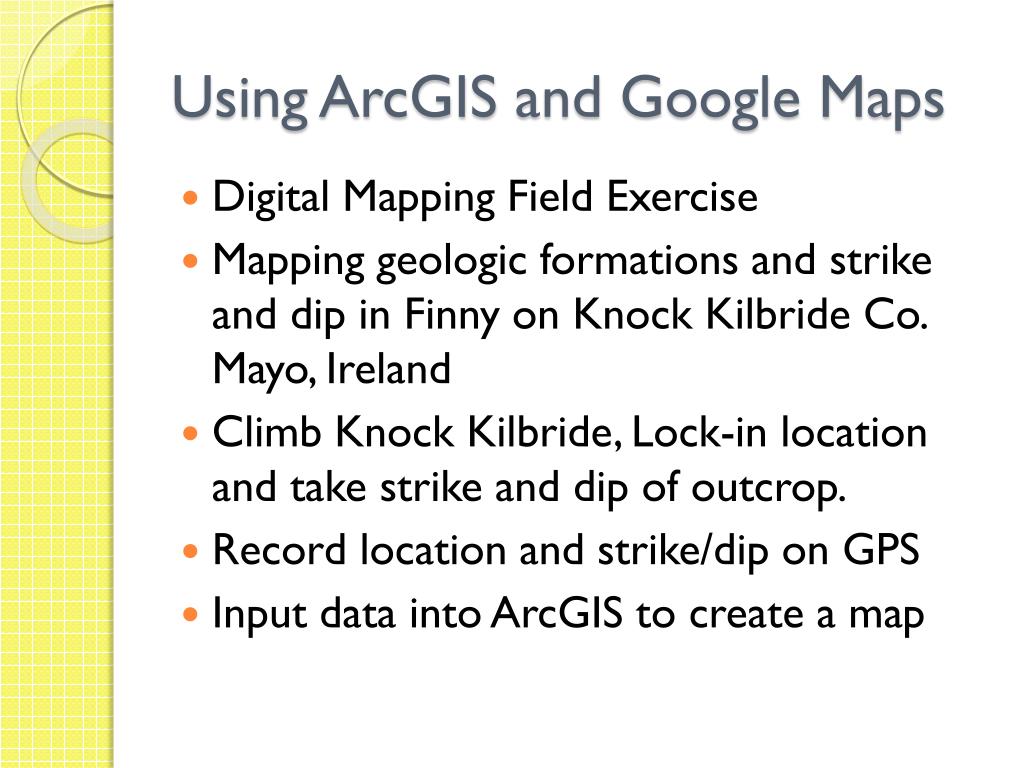 Using ArcGIS and Google Maps • Digital Mapping Field Exercise • Mapping geologic formations and strike and dip in Finny on Knock Kilbride Co. Mayo, Ireland • Climb Knock Kilbride, Lock-in locationand take strike and dip of outcrop. • Record location and strike/dip on GPS • Input data into ArcGIS to create a map