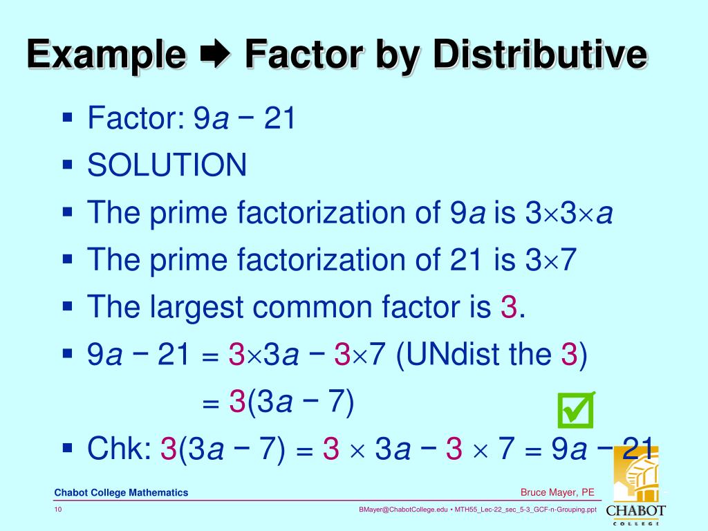 Example  Factor by Distributive • Factor: 9a− 21 • SOLUTION • The prime factorization of 9a is 33a • The prime factorization of 21 is 37 • The largest common factor is 3. • 9a − 21 = 33a −37 (UNdist the 3) = 3(3a−7) • Chk: 3(3a −7) = 3 3a −3 7 = 9a − 21