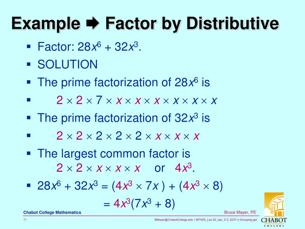 Example  Factor by Distributive • Factor: 28x6 + 32x3. • SOLUTION • The prime factorization of 28x6 is • 22 7 xxxxxx • The prime factorization of 32x3 is • 22 2  2  2 xxx • The largest common factor is 22xxx or 4x3. • 28x6 + 32x3 = (4x3 7x )+ (4x3 8) = 4x3(7x3 + 8)