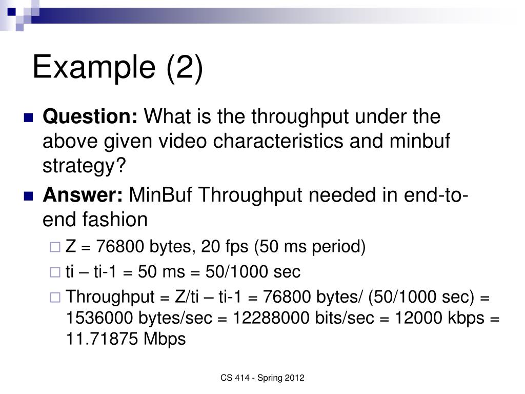 Example (2) • Question: What is the throughput under the above given video characteristics and minbuf strategy? • Answer: MinBuf Throughput needed in end-to-end fashion • Z = 76800 bytes, 20 fps (50 ms period) • ti – ti-1 = 50 ms = 50/1000 sec • Throughput = Z/ti – ti-1 = 76800 bytes/ (50/1000 sec) = 1536000 bytes/sec = 12288000 bits/sec = 12000 kbps = 11.71875 Mbps CS 414 - Spring 2012