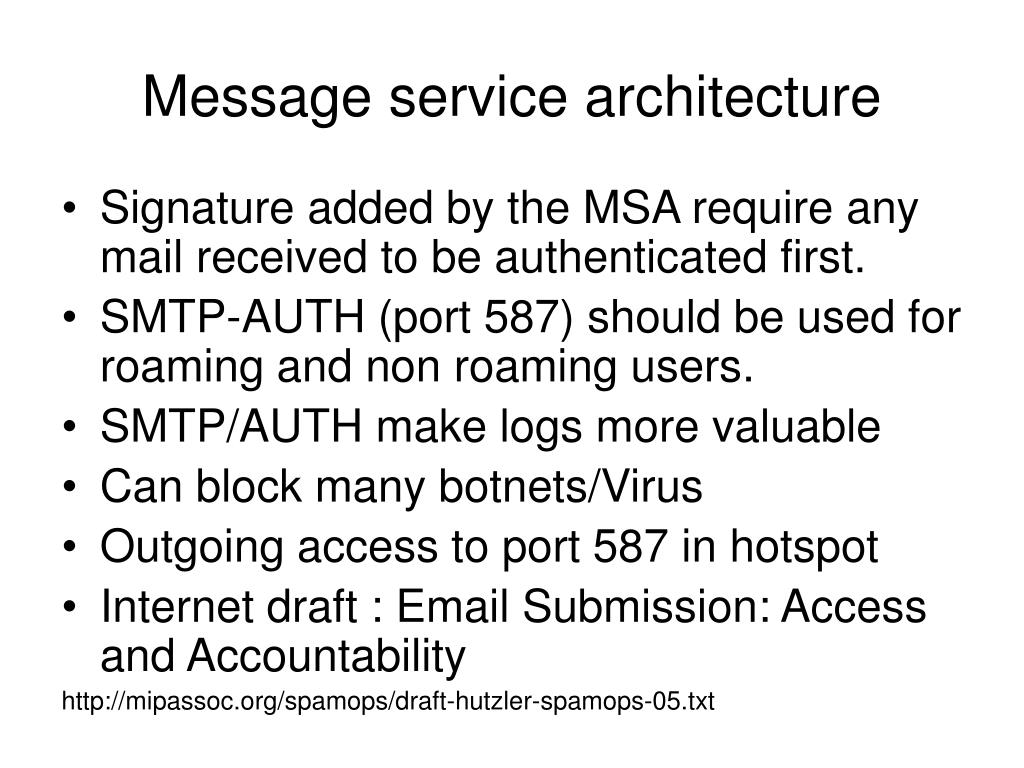 Message service architecture • Signature added by the MSA require any mail received to be authenticated first. • SMTP-AUTH (port 587) should be used for roaming and non roaming users. • SMTP/AUTH make logs more valuable • Can block many botnets/Virus • Outgoing access to port 587 in hotspot • Internet draft : Email Submission: Access and Accountability http://mipassoc.org/spamops/draft-hutzler-spamops-05.txt