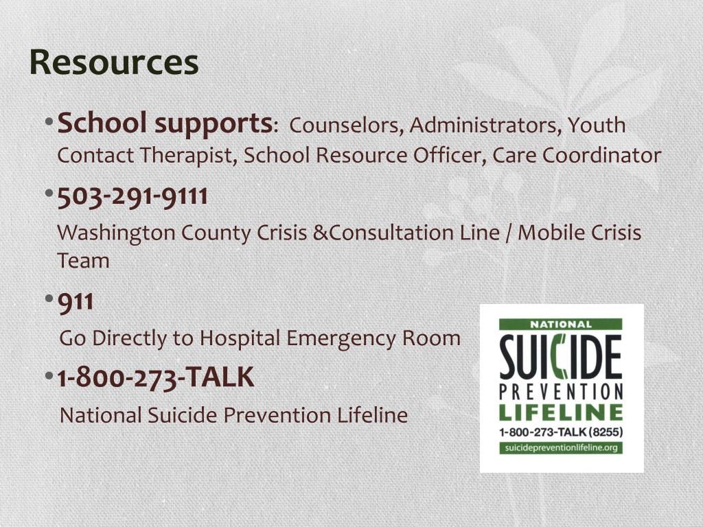 Resources • School supports: Counselors, Administrators, Youth Contact Therapist, School Resource Officer, Care Coordinator • 503-291-9111 Washington County Crisis &Consultation Line / Mobile Crisis Team • 911 Go Directly to Hospital Emergency Room • 1-800-273-TALK National Suicide Prevention Lifeline