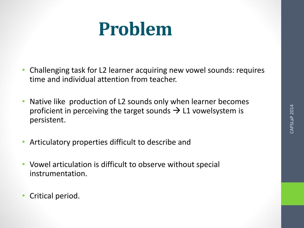 Problem • Challenging task for L2 learner acquiring new vowel sounds: requires time andindividual attention from teacher. • Native likeproduction of L2 sounds onlywhenlearnerbecomesproficient in perceiving the target sounds L1 vowelsystem is persistent. • Articulatory properties difficult to describe and • Vowel articulation is difficult to observe without special instrumentation. • Critical period. CAPSLaP 2014