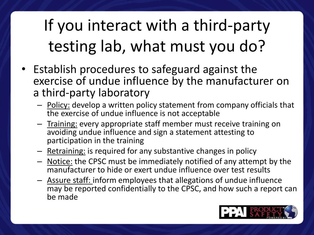 If you interact with a third-party testing lab, what must you do? • Establish procedures to safeguard against the exercise of undue influence by the manufacturer on a third-party laboratory • Policy: develop a written policy statement from company officials that the exercise of undue influence is not acceptable • Training: every appropriate staff member must receive training on avoiding undue influence and sign a statement attesting to participation in the training • Retraining:is required for any substantive changes in policy • Notice: the CPSC must be immediately notified of any attempt by the manufacturer to hide or exert undue influence over test results • Assure staff: inform employees that allegations of undue influence may be reported confidentially to the CPSC, and how such a report can be made