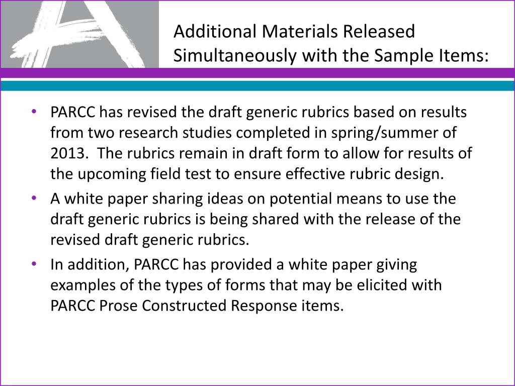 Additional Materials Released Simultaneously with the Sample Items: • PARCC has revised the draft generic rubrics based on results from two research studies completed in spring/summer of 2013. The rubrics remain in draft form to allow for results of the upcoming field test to ensure effective rubric design. • A white paper sharing ideas on potential means to use the draft generic rubrics is being shared with the release of the revised draft generic rubrics. • In addition, PARCC has provided a white paper giving examples of the types of forms that may be elicited with PARCC Prose Constructed Response items.