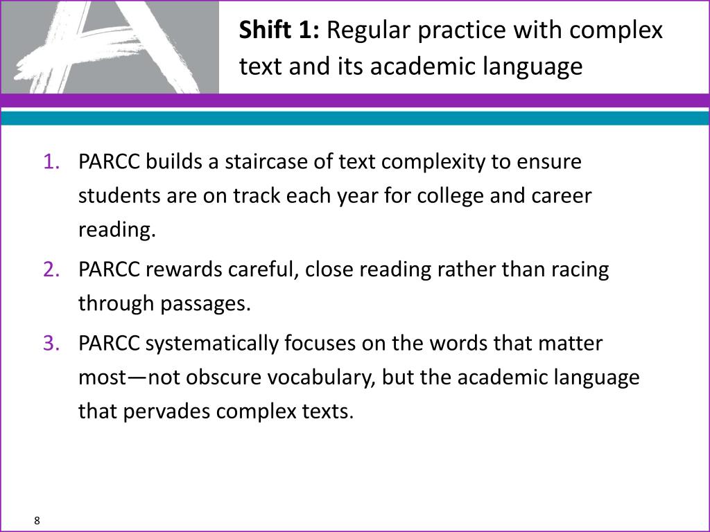 Shift 1: Regular practice with complex text and its academic language • PARCC builds a staircase of text complexity to ensure students are on track each year for college and career reading. • PARCC rewards careful, close reading rather than racing through passages. • PARCC systematically focuses on the words that matter most—not obscure vocabulary, but the academic language that pervades complex texts.