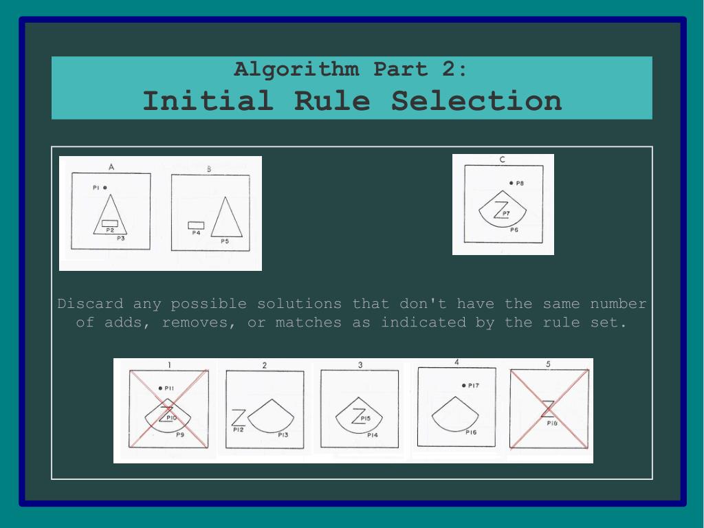 Discard any possible solutions that don't have the same number of adds, removes, or matches as indicated by the rule set. Algorithm Part 2:Initial Rule Selection