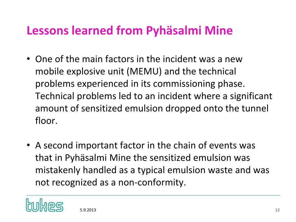 Lessons learned from Pyhäsalmi Mine • One of the main factors in the incident was a new mobile explosive unit (MEMU) and the technical problems experienced in its commissioning phase. Technical problems led to an incident where a significant amount of sensitized emulsion dropped onto the tunnel floor. • A second important factor in the chain of events was that in Pyhäsalmi Mine the sensitized emulsion was mistakenly handled as a typical emulsion waste and was not recognized as a non-conformity. 5.9.2013
