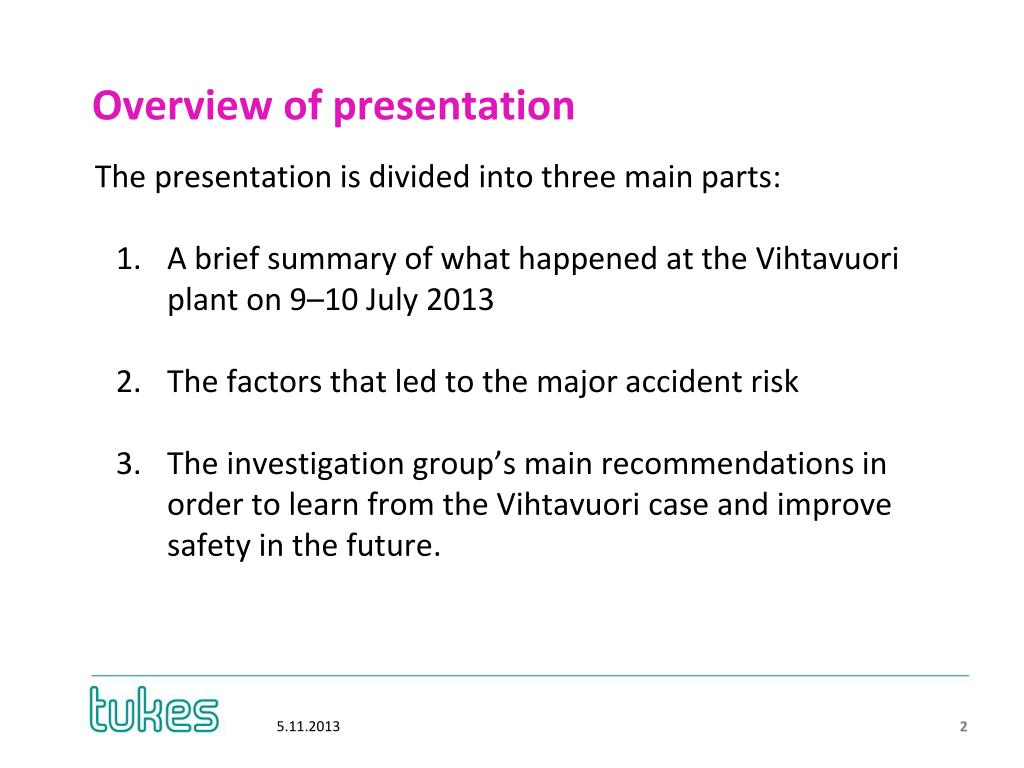 Overview of presentation The presentation is divided into three main parts: • A brief summary of what happened at the Vihtavuori plant on 9–10 July 2013 • The factors that led to the major accident risk • The investigation group’s main recommendations in order to learn from the Vihtavuori case and improve safety in the future. 5.11.2013
