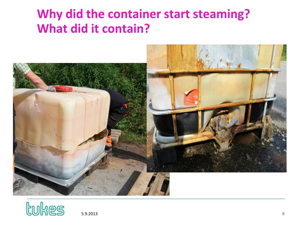 Tukes’s investigation at the Vihtavuori plant • The aim was to discover the chain of events and the risk factors that led to the incident and to make recommendations for safety improvements. • The investigation got underway at the Vihtavuori plant by examining the storage area where the incident took place and interviewing Forcit workers. • Later, the investigation was extended to the Pyhäsalmi Mine, from where the steaming waste container originated. • The investigation team studied Tukes’s archive material, and additional documents and data were requested from the companies in question. • The companies in question demonstrated clear and open co-operation during the investigation. All requested material and clarifications were distributed without any delay. • An accident or a serious incident always has a number of different causes. An accident investigation is always a complex and difficult process, and there is never one definitive cause. • Tukes’s investigation report was published on 1 October, 2012 and is available in Finnish on Tukes’s webpages (www.tukes.fi). These slides and an English summary of the investigation are also available on the website. 5.9.2013